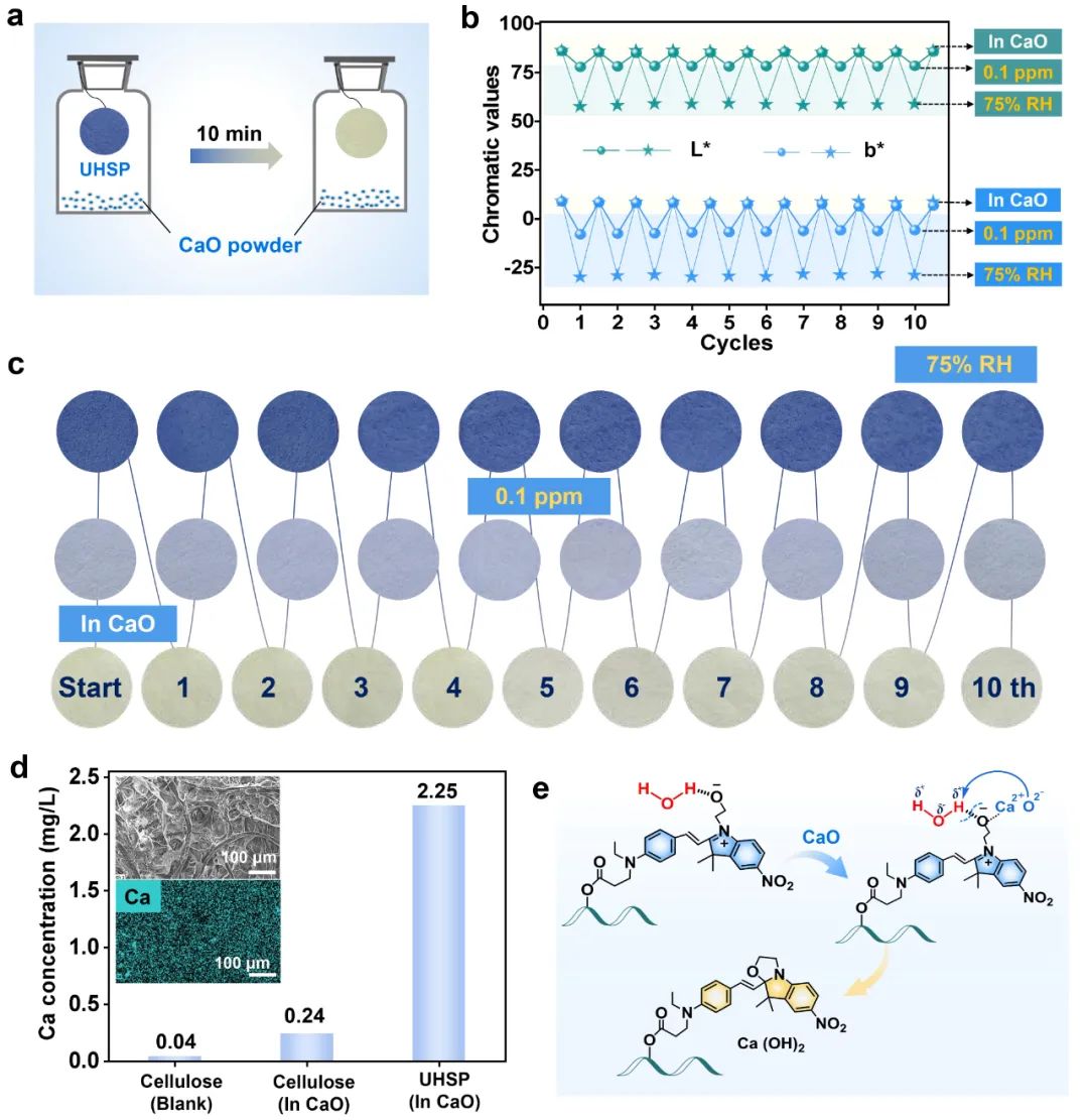 對于能夠檢測超低濕度的傳感器來說,發(fā)展經(jīng)濟和環(huán)境友好的再生(即二次利用)方法一直是科研和市場的迫切需要。本文作者巧妙利用氧化鈣CaO非常規(guī)升華生石灰消化性質(zhì),簡便、高效地實現(xiàn)UHSP的再生與多次循環(huán)利用。如圖3a所示,感濕后藍色的UHSP 懸掛于盛裝CaO粉末的密閉容器上方(稱之為“CaO 氛圍”),僅需十分鐘內(nèi)就可恢復(fù)到最初的淡黃色。無論響應(yīng)高濕度(75%RH)還是超低濕度(0.1ppm)后,再放置“CaO 氛圍”恢復(fù),這些過程重復(fù)循環(huán)10次以上,UHSP的性能均未見有明顯衰退(圖3b,c)。電感耦合等離子體發(fā)射光譜(ICP-ES)測試結(jié)果表明,UHSP在“CaO氛圍”中放置后的Ca含量與放置前相比顯著增加,并且在能量色散光譜(EDS)分布中可以清楚地觀察到Ca 元素(圖3d)。根據(jù)這些測試結(jié)果,可推測其再生機理如圖3e所示:由于響應(yīng)濕度后的UHSP上開環(huán)NO2-OX單元的氧負(fù)離子的靜電作用,使CaO以“類升華”的方式吸附到UHSP上,其通過“石灰消解”反應(yīng)消耗了結(jié)合水。與此同時,開環(huán)的NO2-OX單元由于失去了水的氫鍵輔助和受到“石灰熟化”放熱影響,傾向于恢復(fù)到熱力學(xué)更穩(wěn)定的閉環(huán)形態(tài),從而恢復(fù)至初始的淡黃色狀態(tài)。