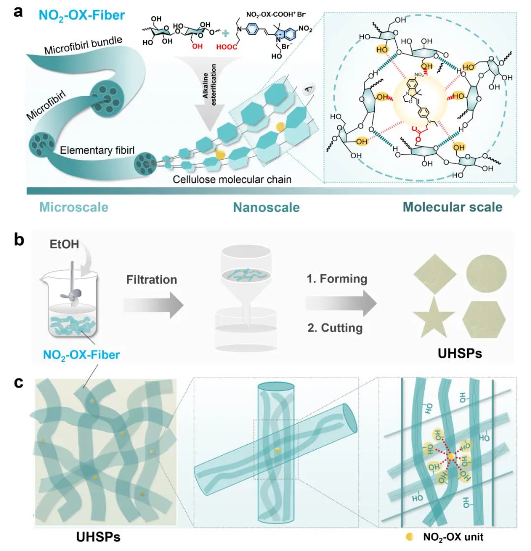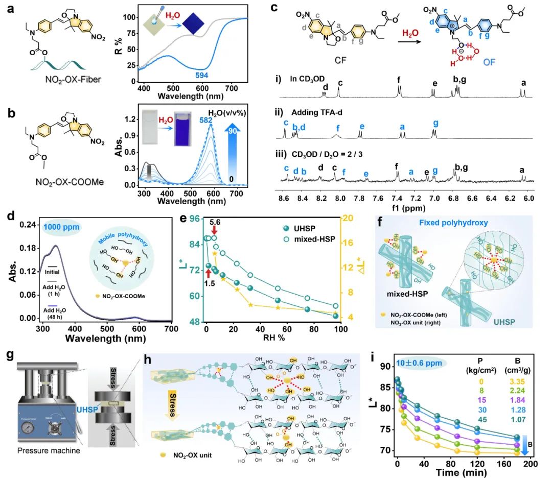 圖1為UHSP的設(shè)計與制備示意圖。水致變色分子開關(guān)是一類在水的刺激下能從關(guān)環(huán)無色態(tài)到開環(huán)顯色態(tài)逐漸并完全轉(zhuǎn)換的一類“新興”分子開關(guān),它由盛蘭/張曉安團隊率先提出與報道(Nat. Commun., 2014, 5, 3044)。作者根據(jù)前期工作經(jīng)驗,將含有羧基的水致變色分子開關(guān)NO2-OX的前體分子(即NO2-OX-COOHBr-)在堿性條件下與具有多級結(jié)構(gòu)的纖維素微纖維的葡萄糖單元上的伯羥基發(fā)生酯化,從而NO2-OX單元得以固定在含有多個羥基的立體微環(huán)境中(圖1a)。將制得的接枝有NO2-OX開關(guān)的水致變色微纖維(NO2-OX- Fiber)分散到乙醇溶液中,再經(jīng)過“類造紙”工藝(過濾、干燥、裁剪)處理,即可得到不同形狀的UHSPs(圖1b)。通過這種“自下而上”的構(gòu)建方法,UHSPs中的每個NO2-OX單元不僅可以受到來自同一微纖維束的“鄰近”羥基的影響,還可受到來自不同微纖維束的“遠程”羥基的影響(圖1c)。因此,這種“類酶”構(gòu)建方法可以提供多級次和多方向的多羥基(或氫鍵)網(wǎng)絡(luò)微環(huán)境,這有利于NO2-OX開關(guān)單元的開環(huán),以實現(xiàn)預(yù)期的超低濕度裸眼可視化檢測。